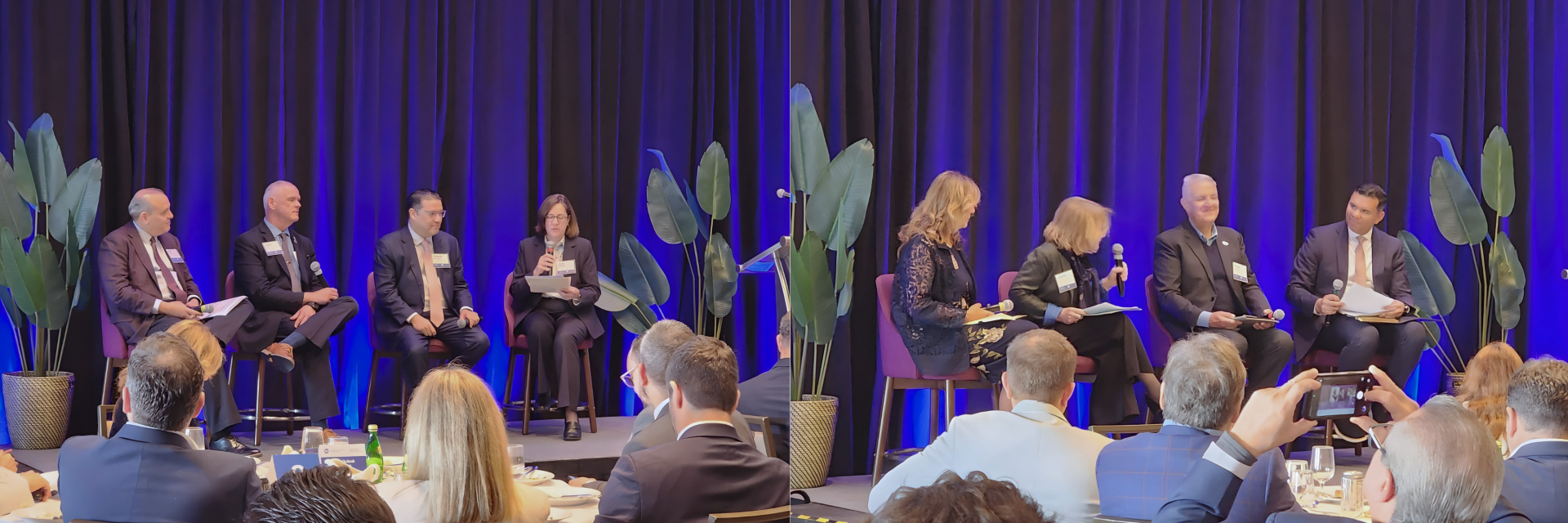 First photo, from left to right: Basil Khalil, Vice President of Operations, FedEx Express Latin America and the Caribbean; Ralph Cutie, Director and Chief Executive Officer (CEO), Miami International Airport; Eduardo Sanz Lovatón, Minister of Industry, Trade and MSMEs of the Dominican Republic; and Anne McKinney, Executive Vice President, AACCLA.Second photo, from left to right: Maria Luisa Boyce, Vice President of Global Public Affairs, UPS; Felipe Espinosa, Chief Executive Officer (CEO), Ecuadorian-American Chamber of Commerce (AmCham Ecuador – Quito); Isabella Cascarano, Deputy Assistant Secretary for the Western Hemisphere, International Trade Administration (ITA), U.S. Department of Commerce; and Cesar Vence, Executive Director, AACCLA.
